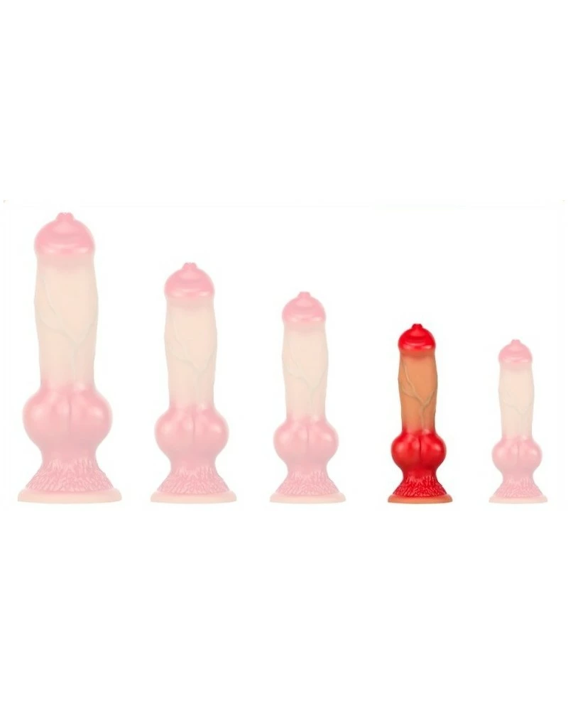 Le gode Inuk est ici dans sa version M. Il est composĂ© d’une forme de pĂ©nis de chien. Il a une longueur insĂ©rable de 16.5cm et une largeur de 3.8cm sur le gland. La largeur maximale est de 5.5cm sur les bourses. Base ventouse. En silicone souple